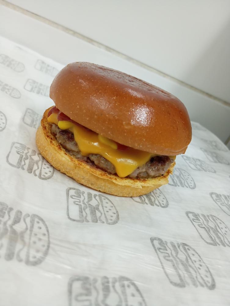 Um Delicioso Burguer de 150g, Queijo Cheddar, Cebola Crua, Picles, Catchup e Mostarda